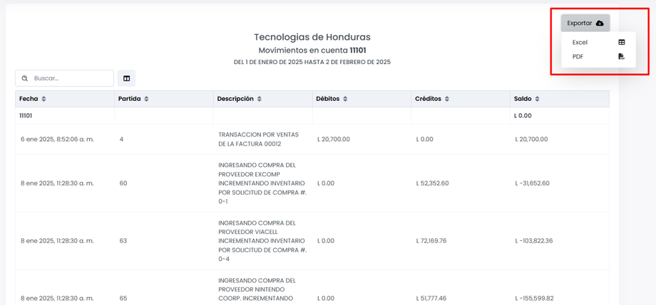 Para descargar el reporte de nuestra cuenta en Excel o PDF debe de seleccionar el botón de exportar.