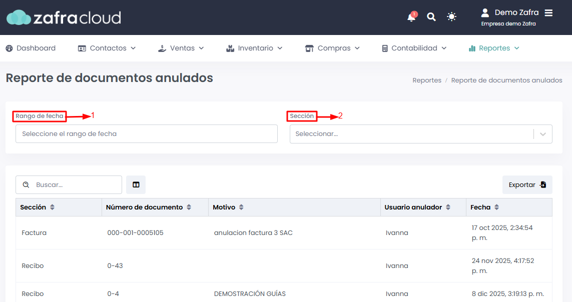 Ingresaremos al módulo de Reportes → Reporte de documentos anulados.