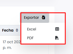 Si necesitas exportar dicho reporte lo podrás hacer desde el botón de “Exportar” teniendo la opción de PDF o Excel.