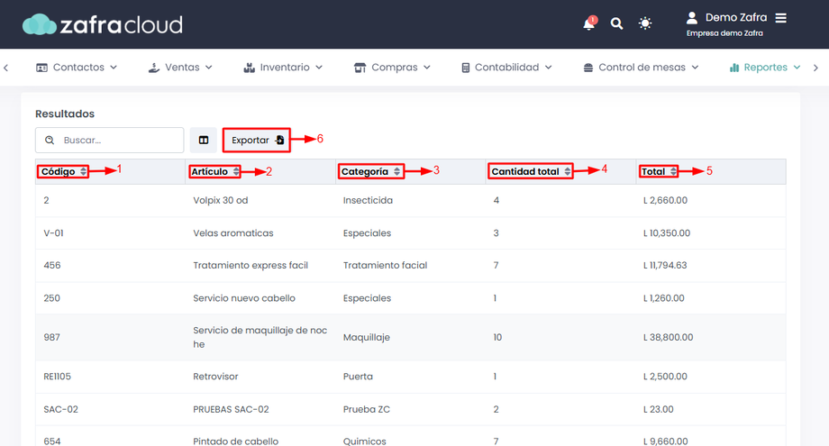 3. Artículos: Muestra resultados únicamente de los productos o servicios seleccionados.