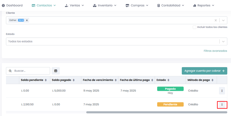 Luego deberás identificar la cuenta por cobrar a cobrar y darás sobre los tres puntos para habilitar las opciones adicionales.