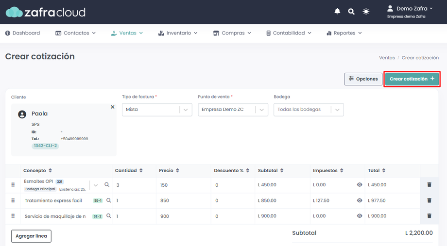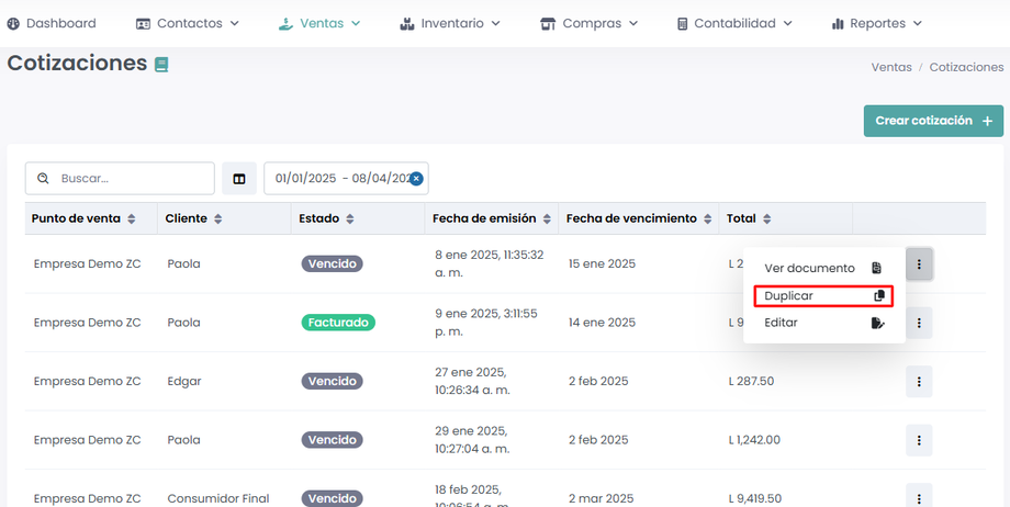 Nos aparecerá la cotización duplicada, podremos hacer diferentes modificaciones como lo es el cliente, tipo de factura, cantidad, entre otros y luego daremos en “Crear cotización+”.