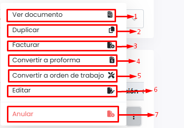 Convertir a proforma: Convierte el documento a una proforma.