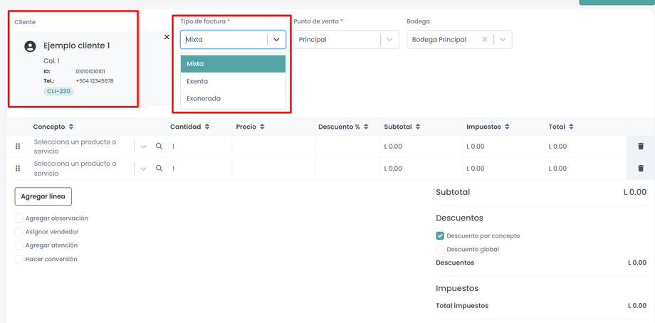 1. Mixta: Permite generar un documento que incluye productos gravados con ISV (Impuesto sobre Ventas) y productos exentos. Esta opción se encuentra activa por defecto.
