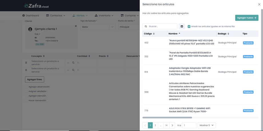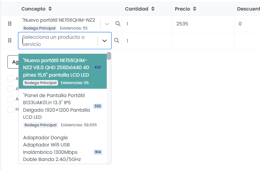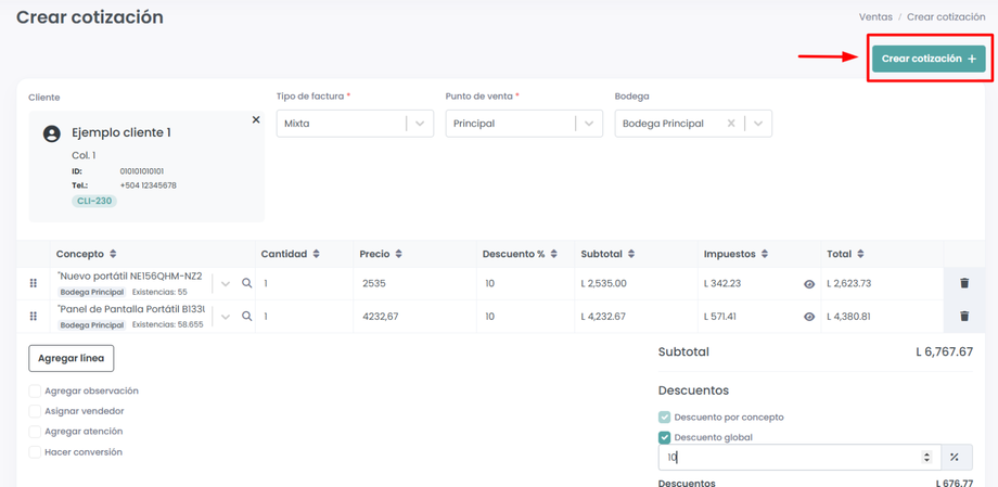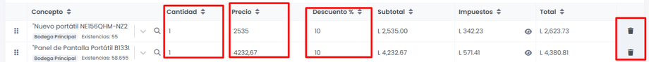 • Una vez seleccionados los ítems que deseamos incluir en la cotización, estos se mostrarán en la vista correspondiente, donde podremos ajustar la cantidad, el precio y aplicar descuentos a cada uno de ellos.