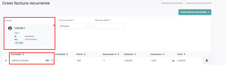 Una vez que hayas añadido todos los servicios y verificado los valores, haz clic en Crear Factura Recurrente.