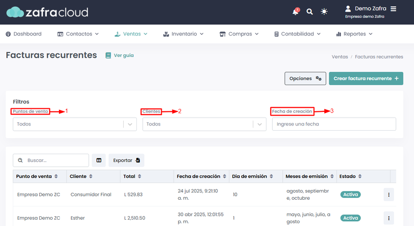 Ingresaremos al módulo de Ventas -> Facturas recurrentes.