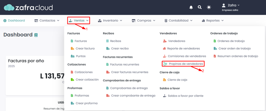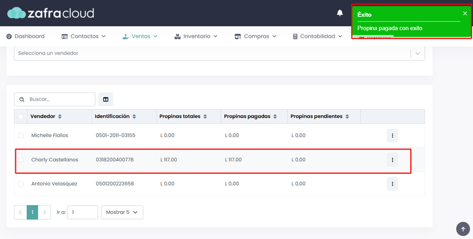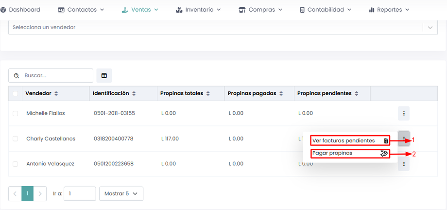 Para visualizar las propinas asignadas al vendedor, deberemos ingresar al módulo de Ventas -> Propinas de vendedores.