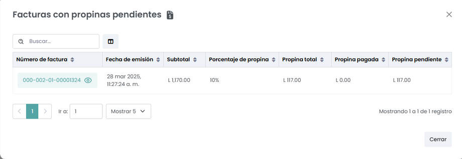 Al seleccionar esta opción, visualizaremos las facturas emitidas con la propina, donde tendremos los siguientes datos: