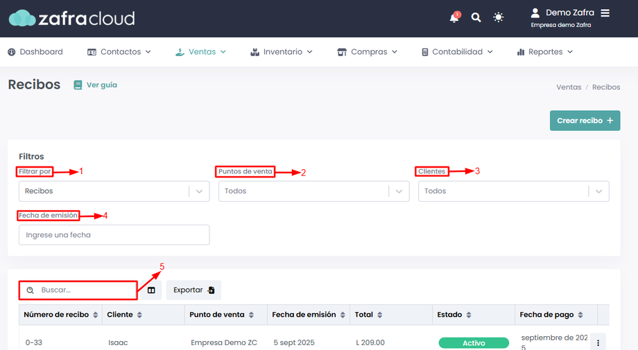 Podremos visualizar nuestros recibos emitidos hasta la fecha, contando también con los filtros de: