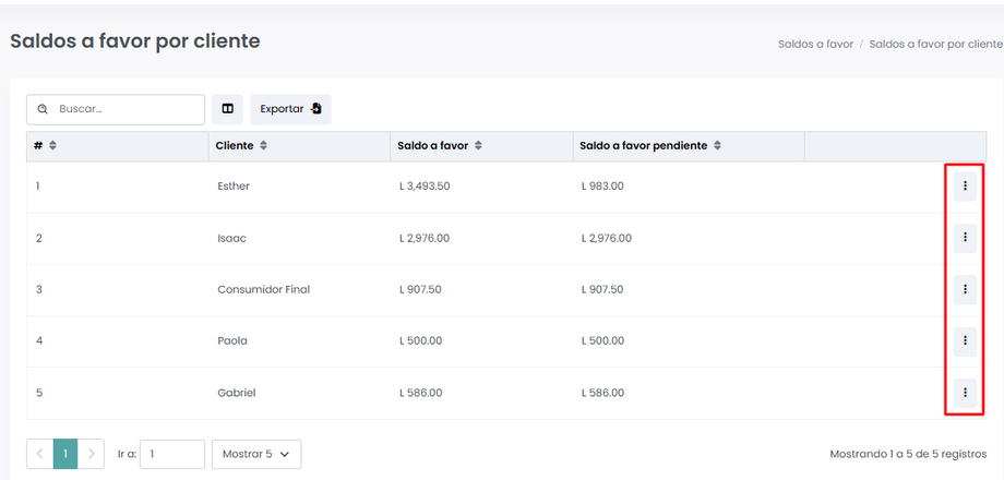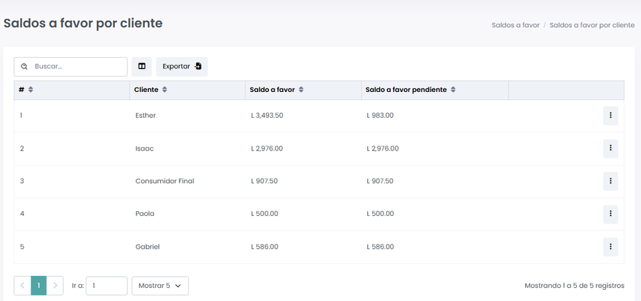 Tendremos la siguiente pantalla donde podrás visualizar los saldos a favor de cada cliente hasta el momento, junto a la siguiente información.