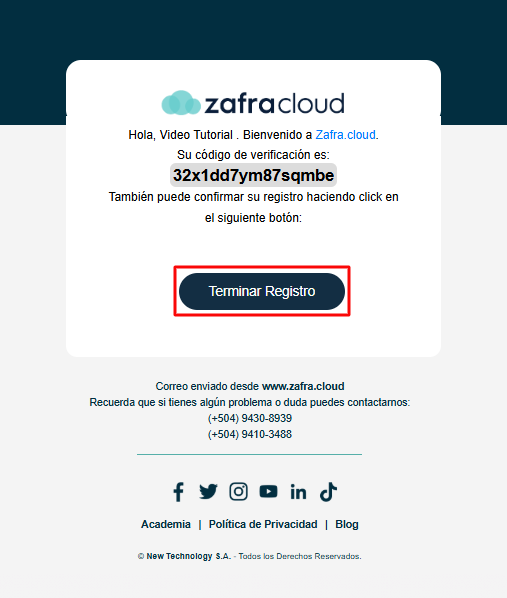 4. Al entrar a nuestro correo nos aparecerá el siguiente mensaje al cual daremos “Terminar Registro” y nos aparecerá la pantalla de inicio de Zafra Cloud.
